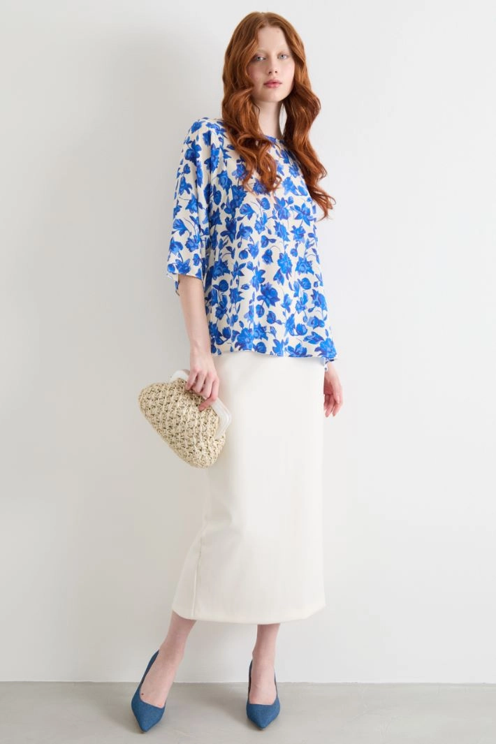 Loose-fit blouse in printed pure silk twill, with a round neckline and three-quarter sleeves. The back features an inverted pleat and a teardrop button fastening.