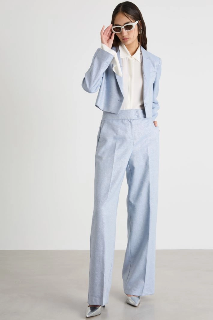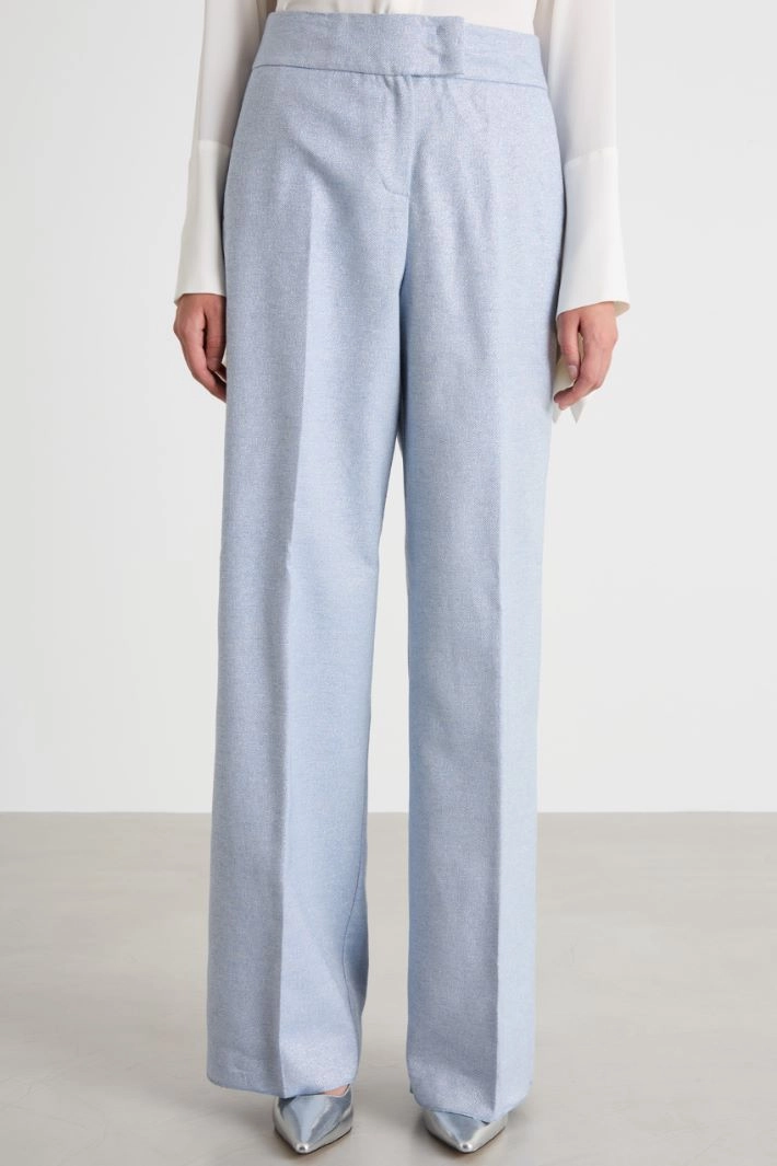 Palazzo trousers in a laminated cotton blend, with French pockets at the front, welt pockets at the back and a pressed crease. Hook and zip fastening.