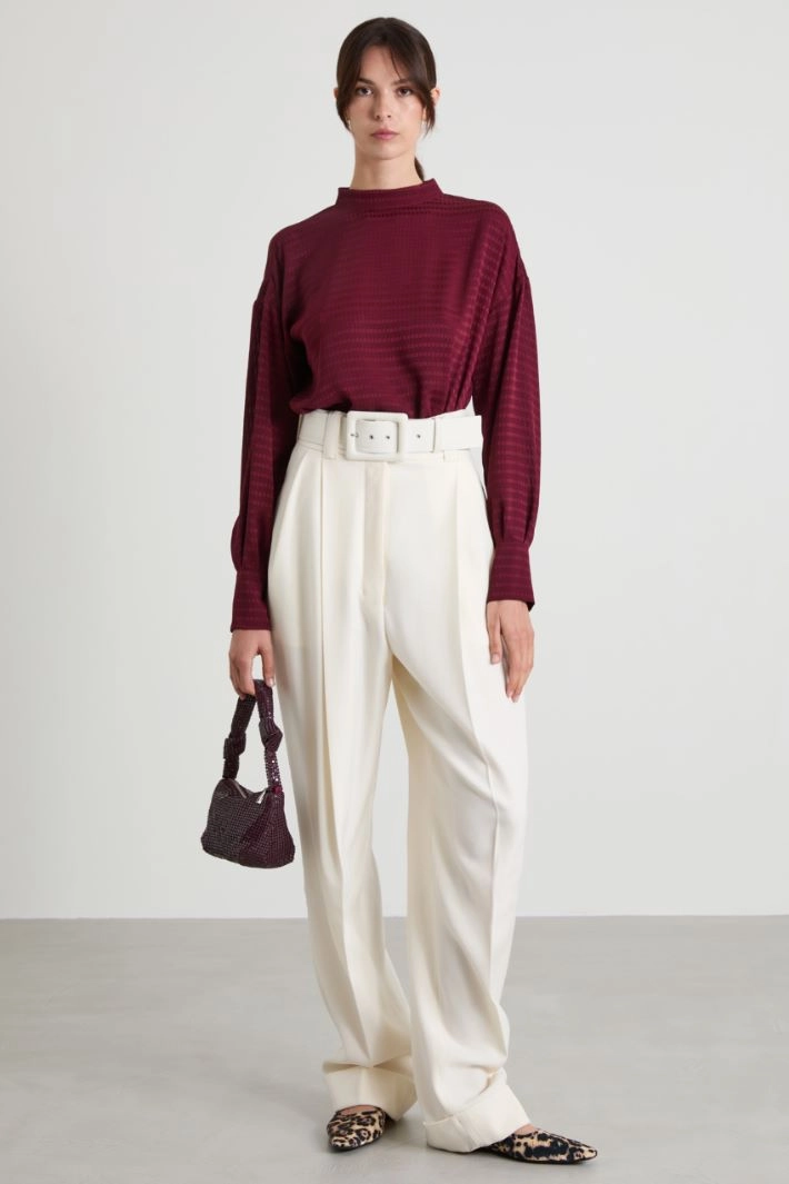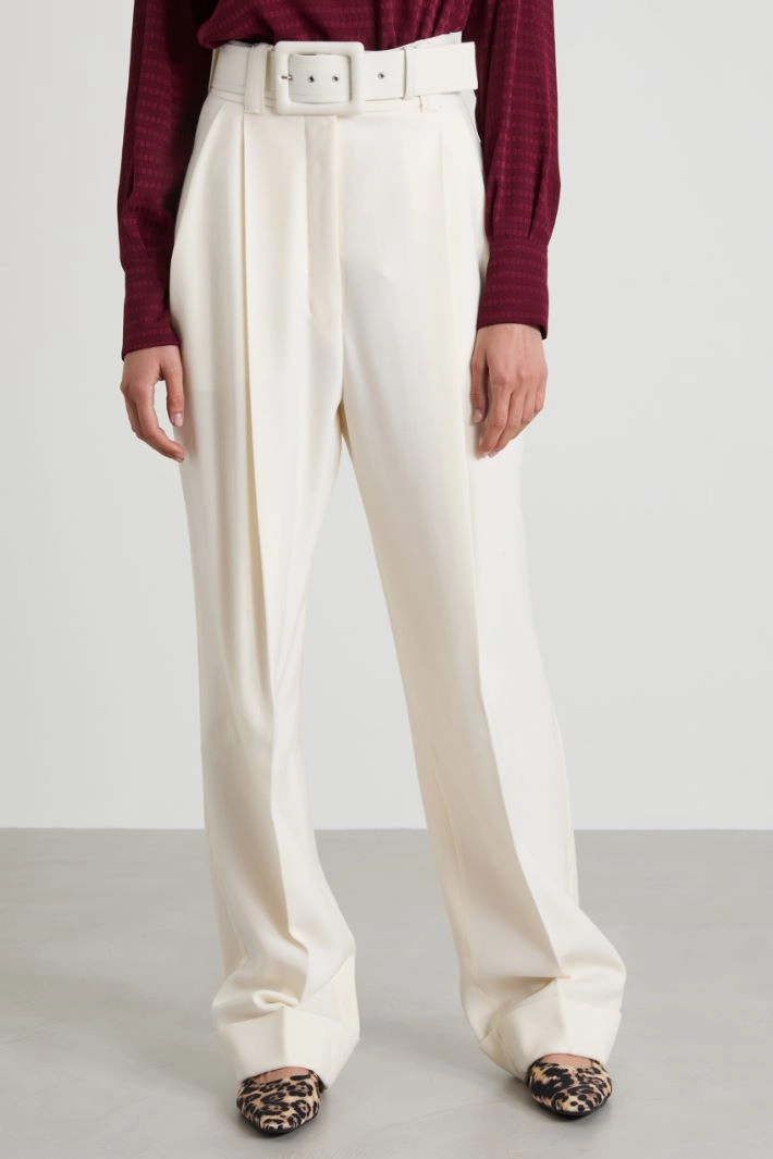 Wide-leg trousers in pure wool woven fabric finished with a satin band along the sides, pleats and belt loops at the waist, inset pockets at the front, welt pockets at the back and crease ironed lengthwise with turn-up at the bottom. Hidden fastening with zip, button and hooks. Belt with coordinated maxi buckle.