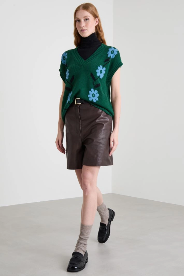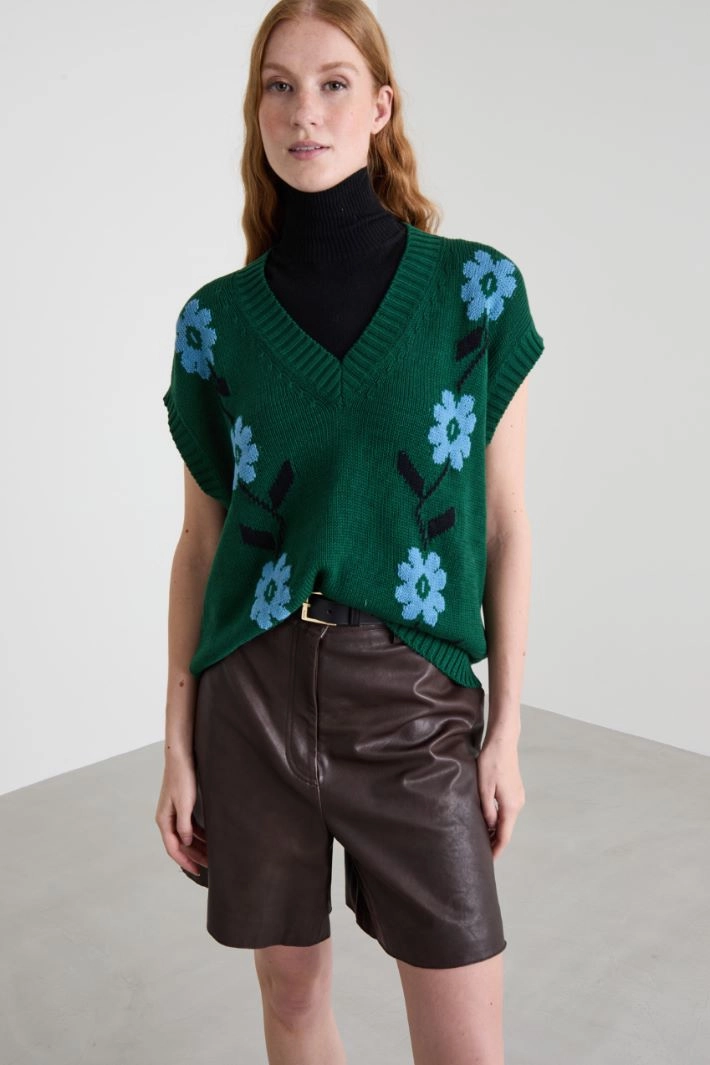 Oversized gilet in pure cotton yarn with inlay on the front, V-neck and ribbed finishes.