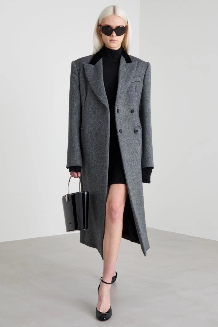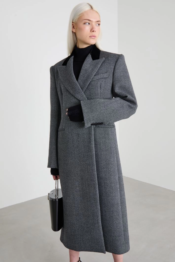 Long, fitted coat in pure, yarn-dyed wool chevron, with a peak collar finished with a velvet insert, shoulder pads, long sleeves with buttons, a breast pocket and double-welt side pockets. Central vent on the back and double-breasted fastening with buttons. Lined.
