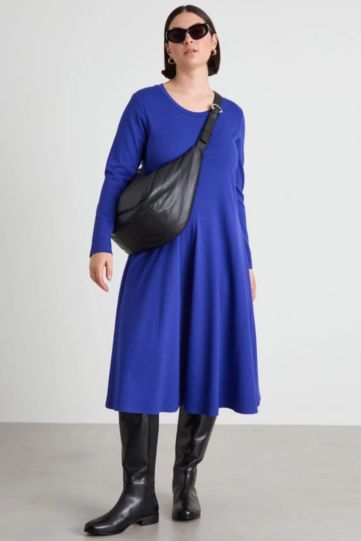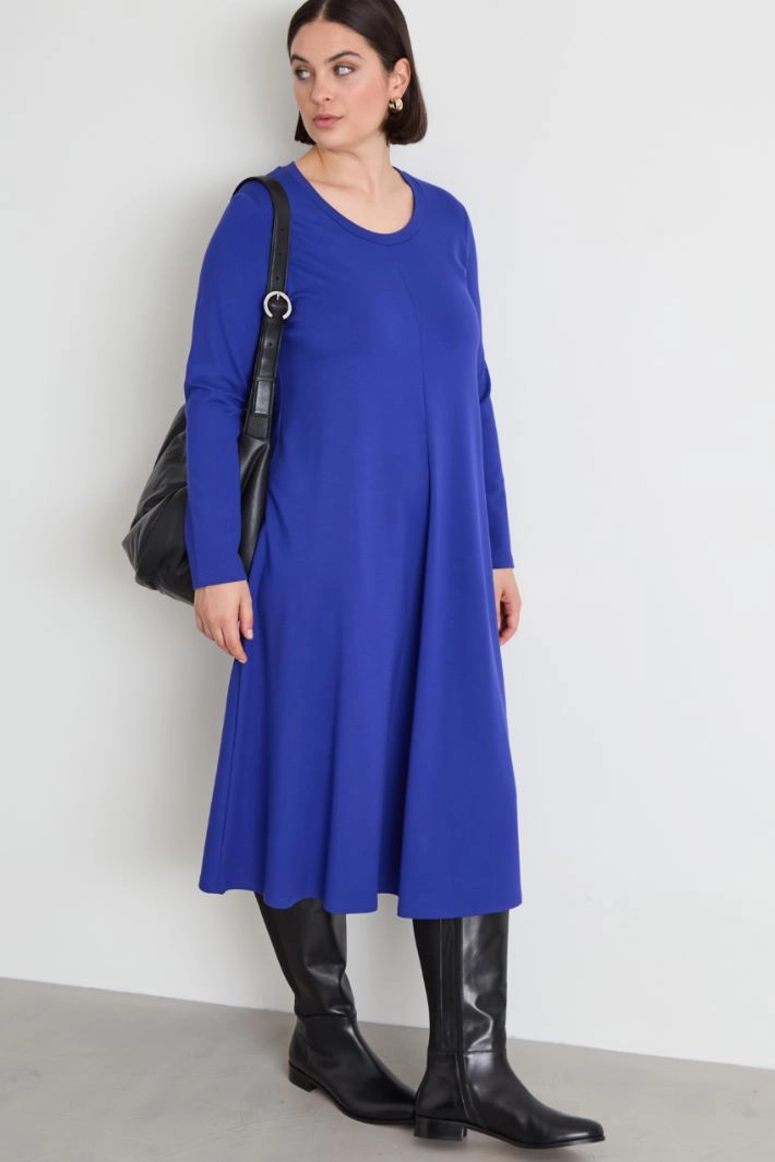 Flared dress in stretch viscose blend jersey, with round neckline and long sleeves.