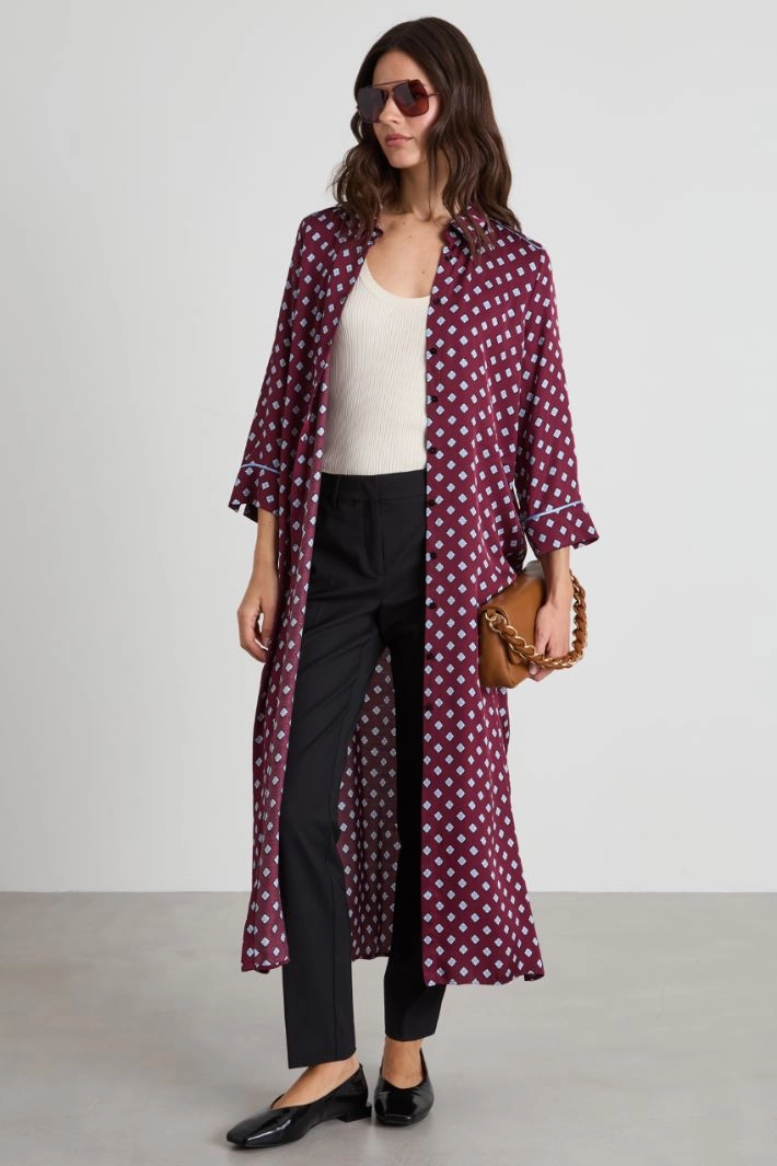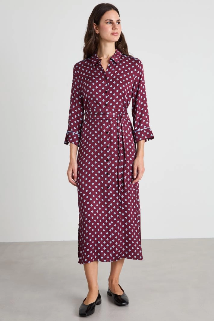 Straight-fit shirt dress in flowing printed pure viscose fabric, with classic collar, three-quarter sleeves, side slits and visible fastening with buttons along the entire length. Matching sash.