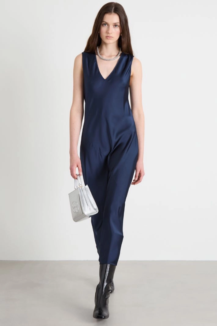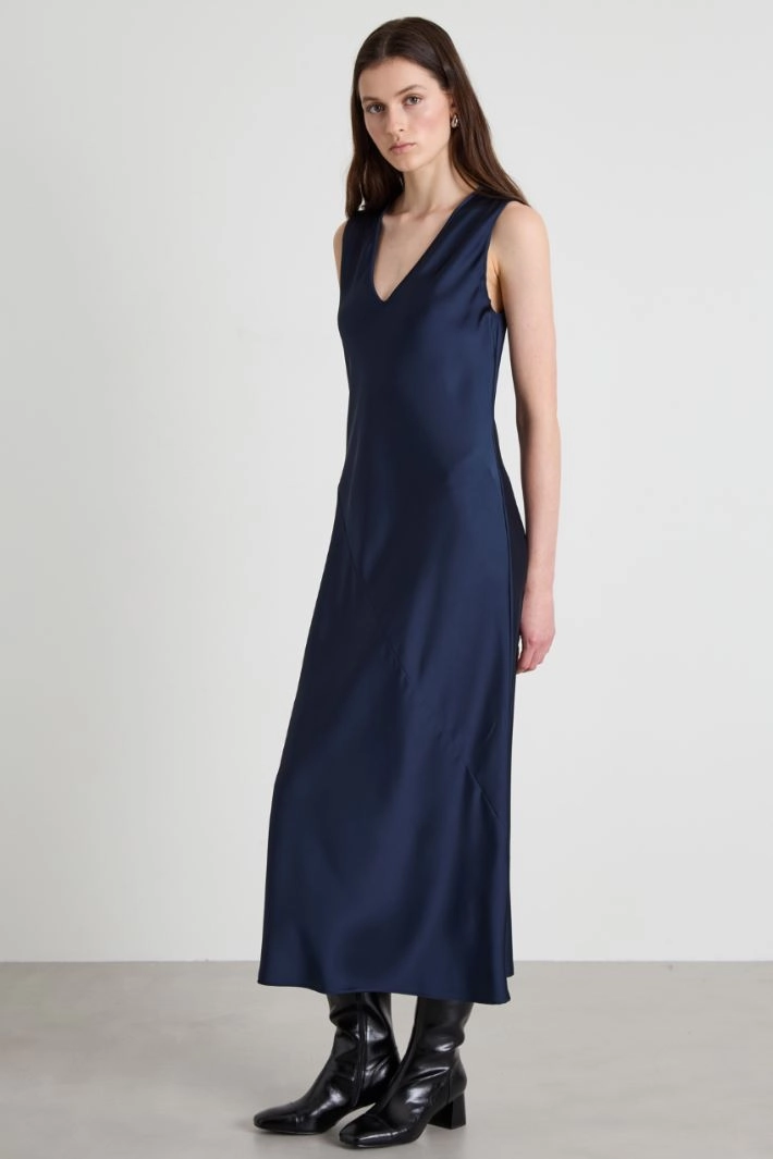 Semi-fitted satin dress with V-neckline.
