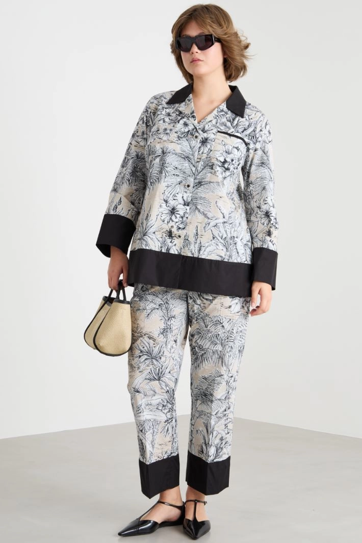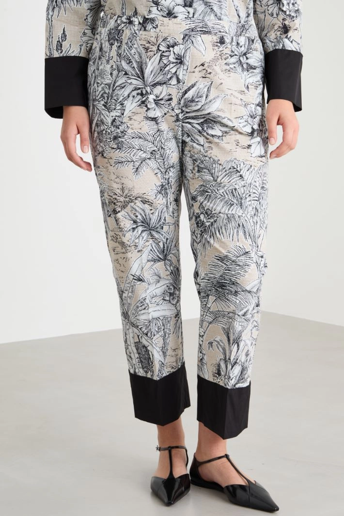 Cigarette-fit trousers in printed cotton poplin, featuring French pockets, an elasticated waist and a contrasting panel at the hem.
