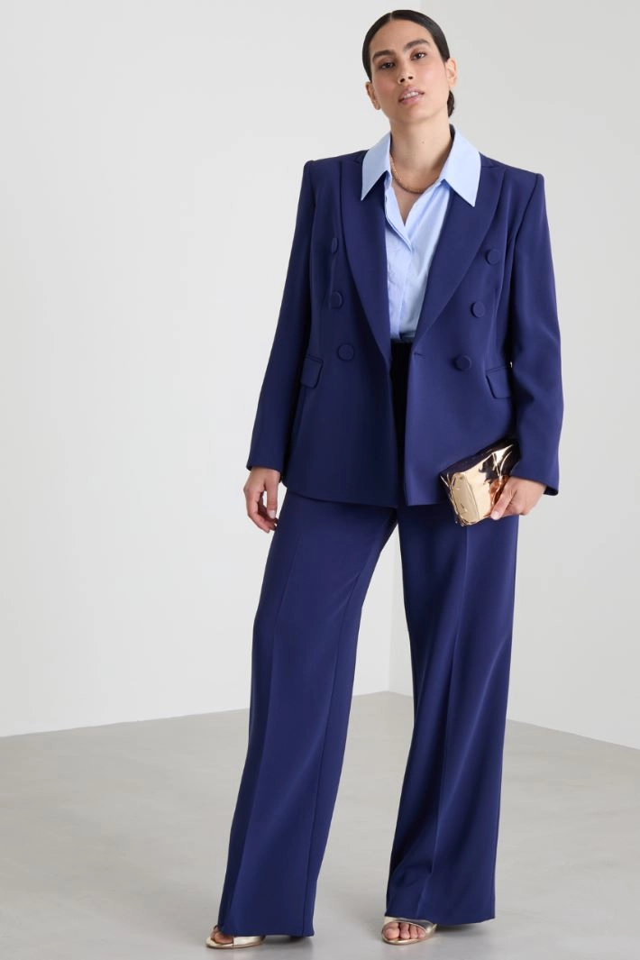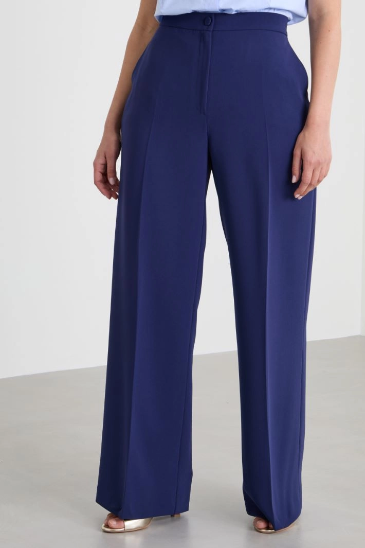 Cady palazzo trousers with French side pockets, crease along the length and fastening with hidden zip and covered button.