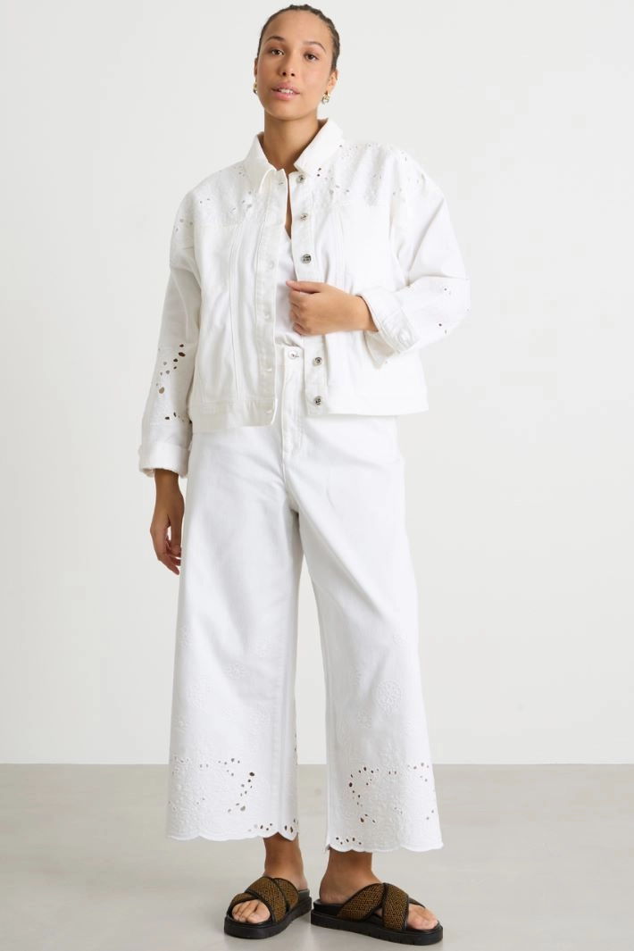 Boxy-cut jacket crafted in cotton bull with Broderie Anglaise. This piece features a point collar, long sleeves with buttoned cuffs, in-seam pockets and tabs on the back. Button fastening.