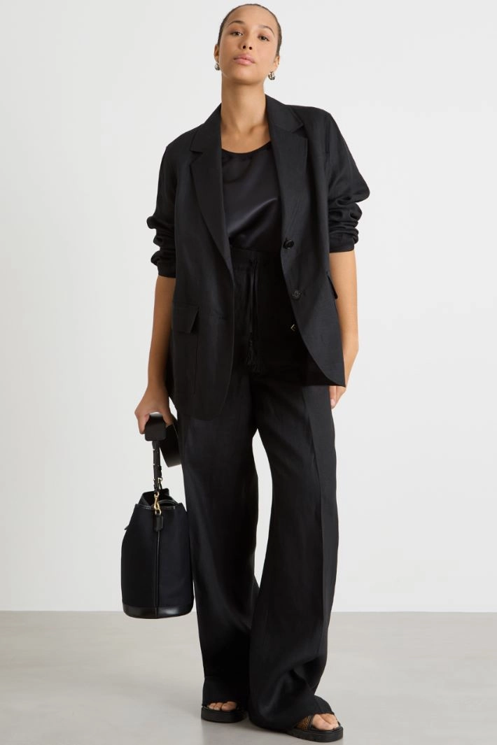Jogger-style trousers crafted in pure stretch linen canvas. This piece features an elasticated drawstring waist, finished with tassels embroidered with beads, and French pockets.
