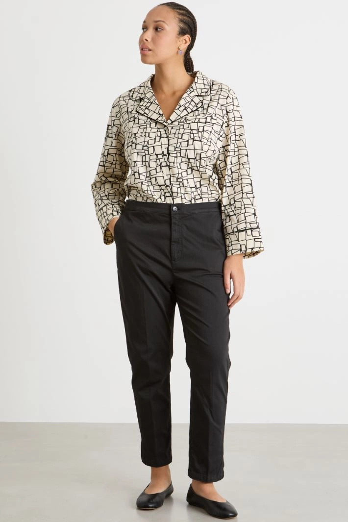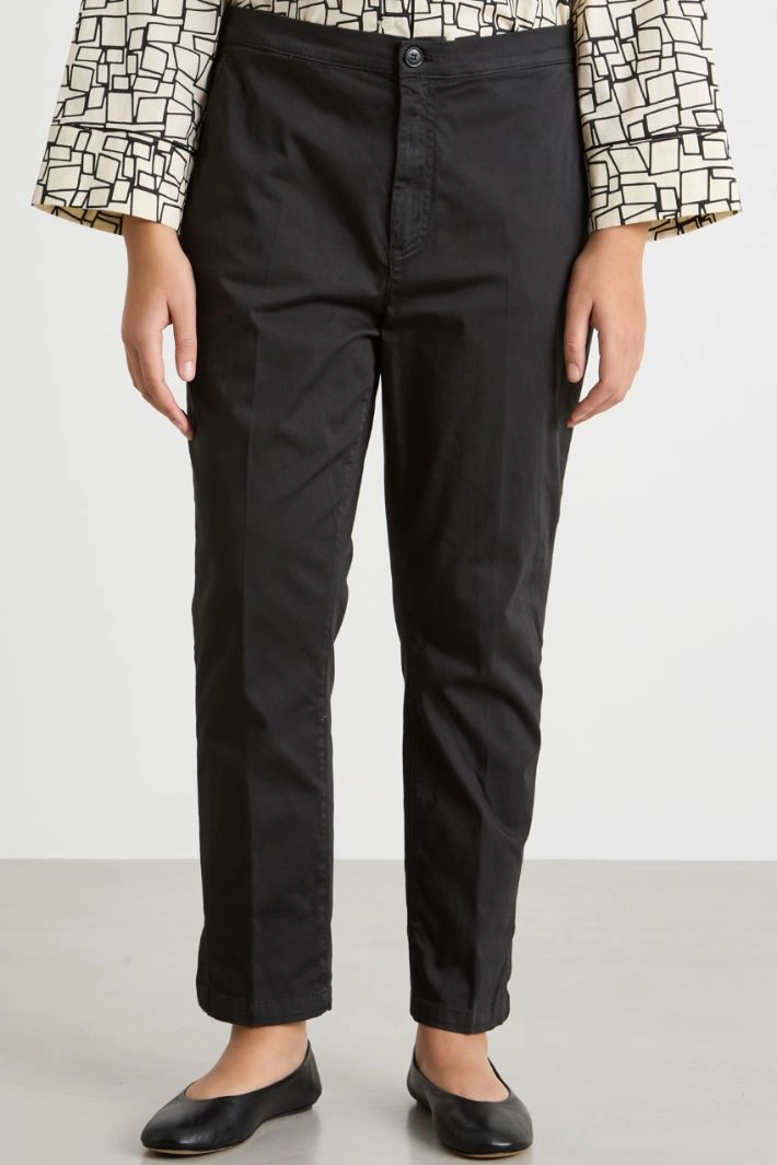 Slim-fit chinos crafted in cotton satin, featuring French pockets, an elasticated rear waistband and overlapping vents at the hem. Zip and button fastening.
