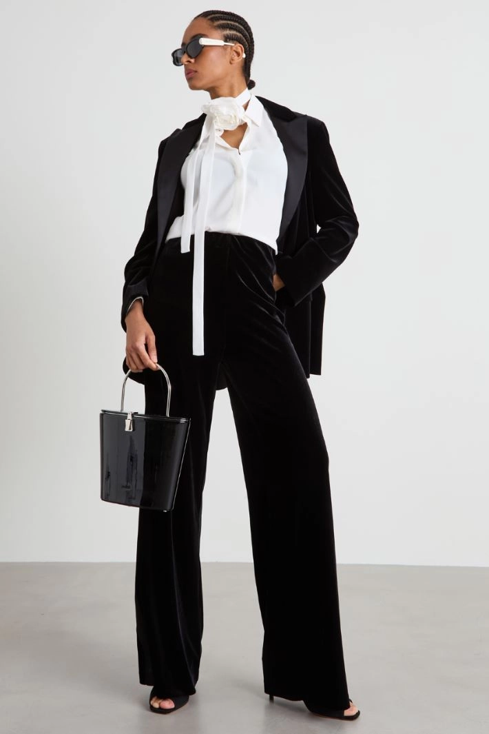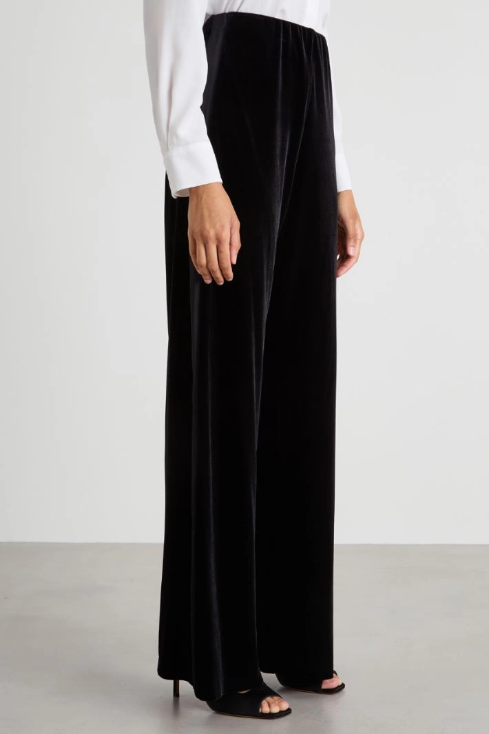 Straight-cut trousers in stretch velvet jersey with satin side bands and elasticated waistband.